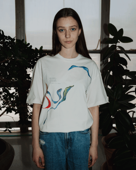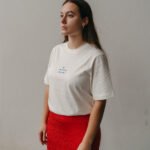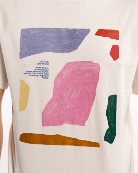 Tričko má oversize strih a krémovo bielu farbu.