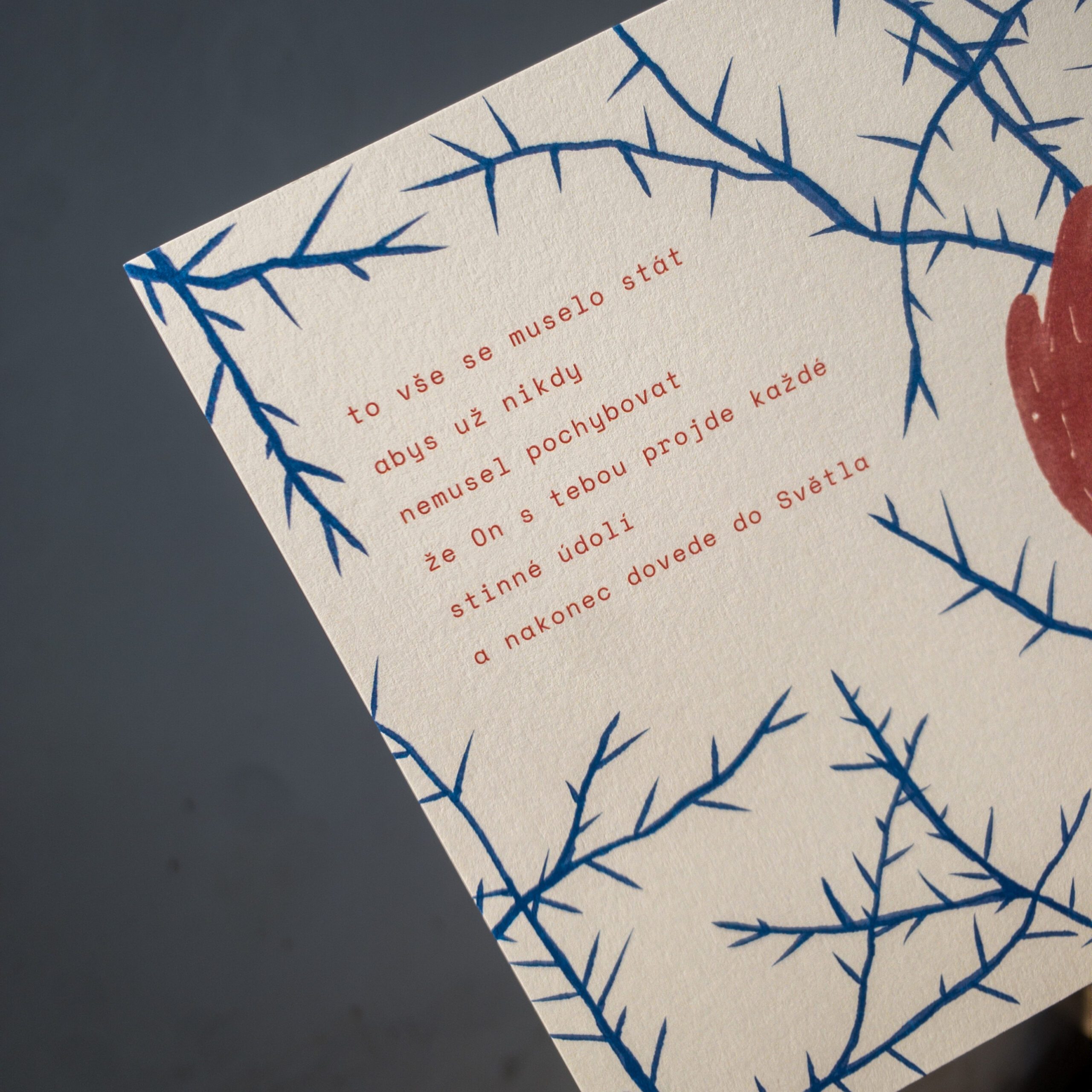 Čtvercová pohlednice (14,5×14,5 cm) je vytištěna na ekologickém neběleném grafickém papíru Munken Pure Rough 300g. Zadní strana je prázdná, jen s předtištěným řádkováním pro napsání adresy a prostorem pro nalepení poštovní známky.