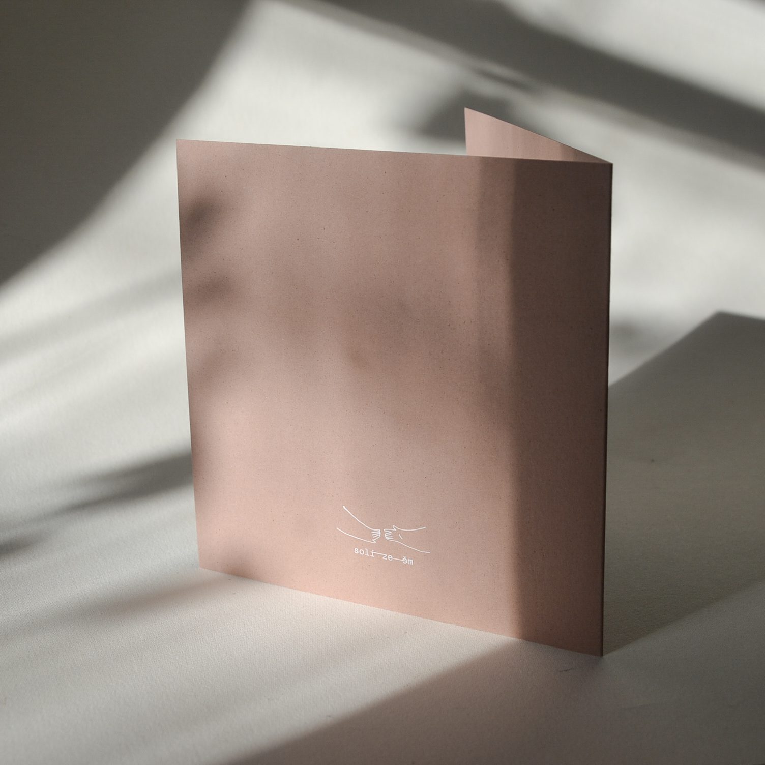 Otevírací karta ve čtvercovém formátu (14,5 × 14,5 cm) vytištěná na ekologickém grafickém papíře Crush Almond 250 g. Archy s jemnou strukturou vláken částečně obsahují odpad ze zpracování mandlí – skořápky se při výrobě jemně rozdrtí a přidají do papírové hmoty.