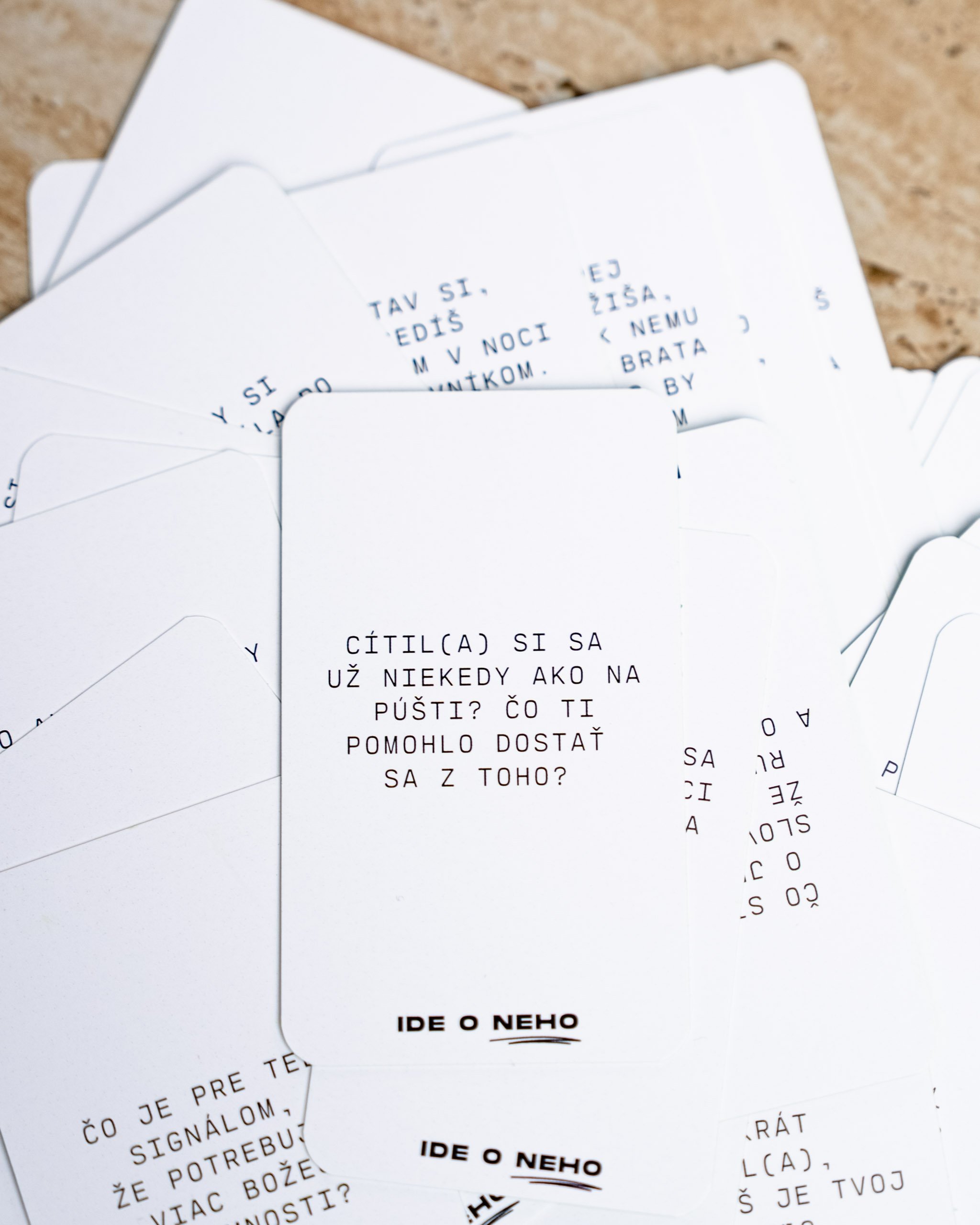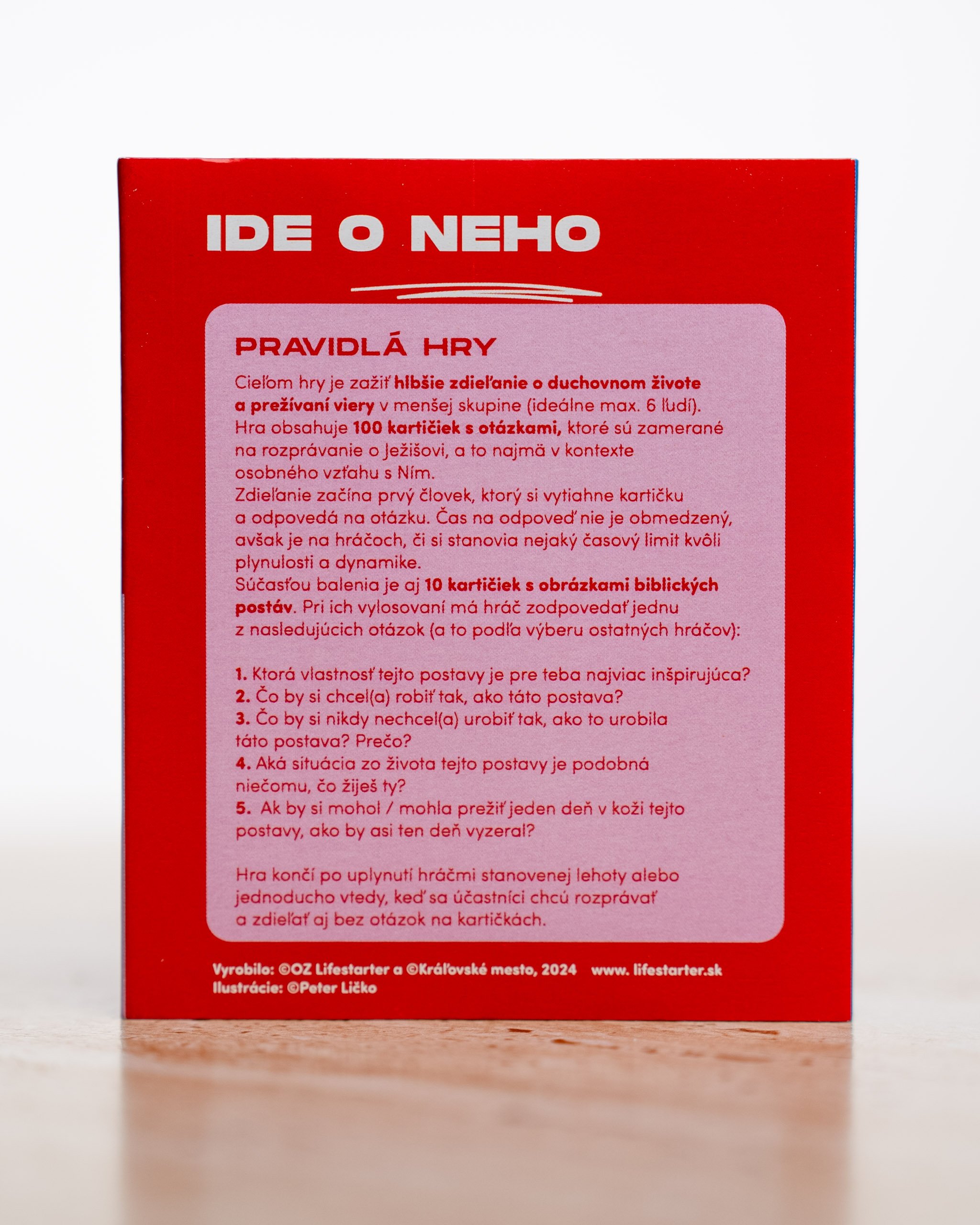 „Ide o Neho“ je spoločenská hra určená pre menšie skupiny (ideálne do 6 osôb), ktorá podnecuje hlbšie rozhovory o viere, duchovnom živote a osobnom vzťahu s Ježišom Kristom. Obsahuje 90 premyslených otázok na zamyslenie a 10 kartičiek s biblickými postavami, ktoré otvárajú priestor pre inšpiratívne diskusie.