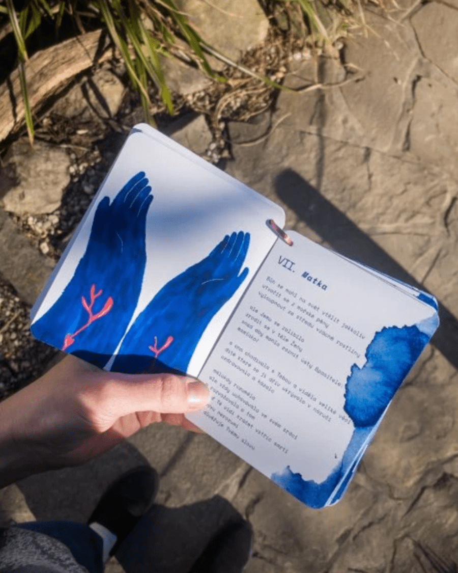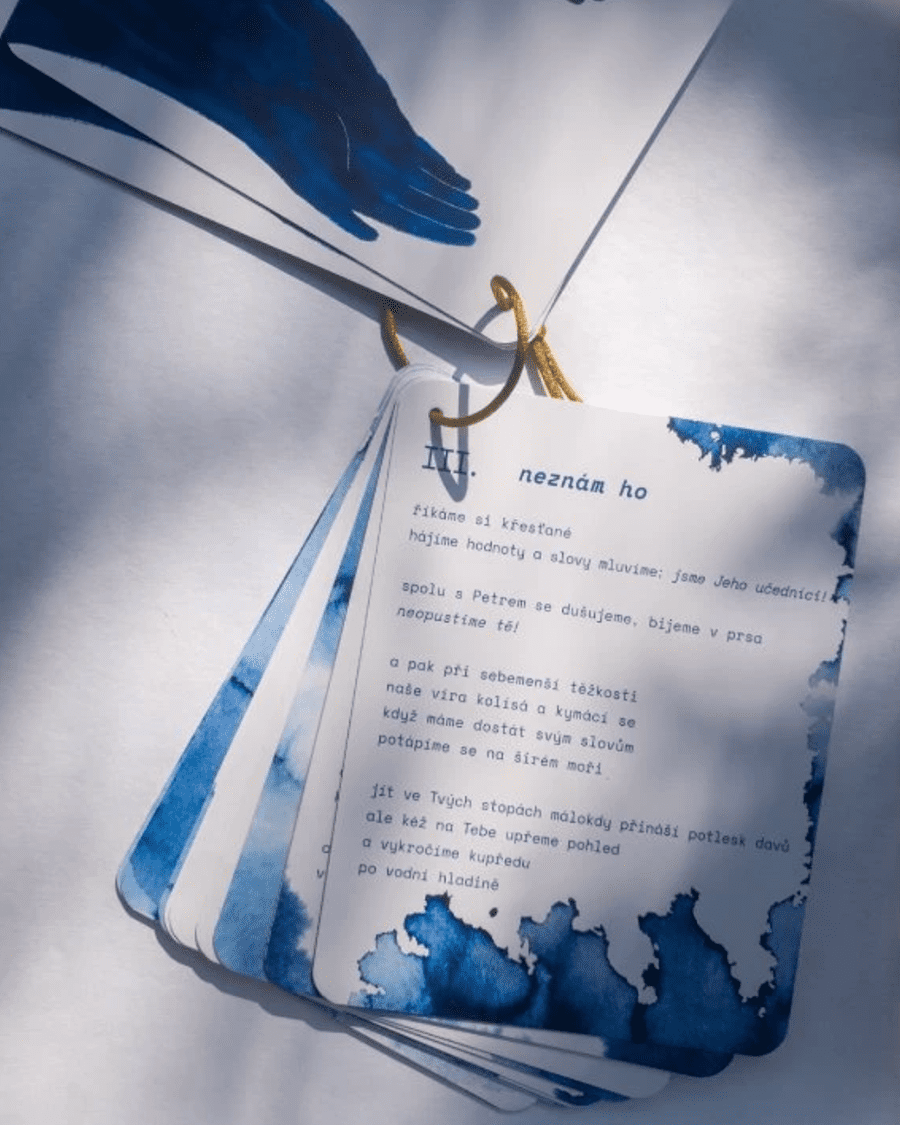 „Eliška kreslí barvami a Tereza slovy. Všechno vzniká za pohybu, v chaosu a v pozadí vyrůstají naše dvě děti – Ema a Šimon. Hodně pochybujeme a často si věci komplikujeme. Ale do toho všeho se velmi snažíme zvát Pána a prosit ho – jestli je ti naše dílo milé, použij si ho tak, jak potřebuješ. Vždyť Ty, narozený od nás, vidíš za tři rohy.”