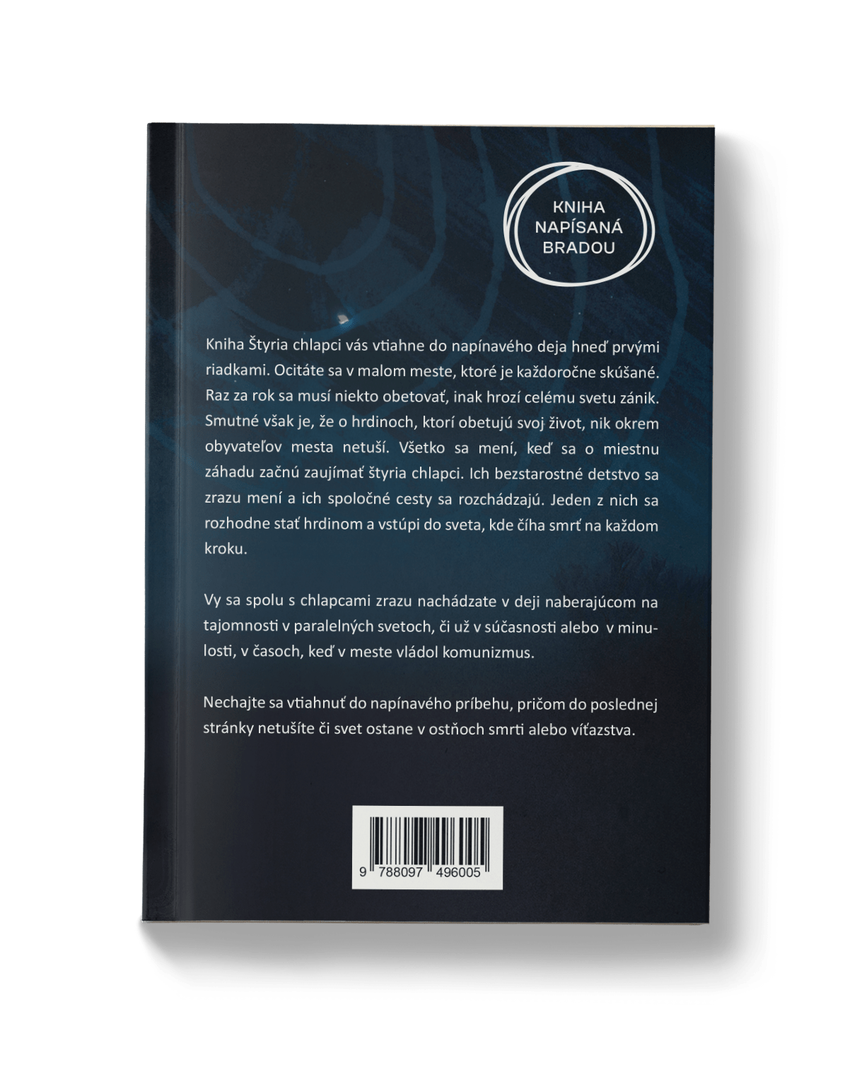 Kniha Štyria chlapci vás vtáhne do napínavého děje hned prvními řádky. Ocitáte se v malém městě, které je každoročně zkoušeno. Jednou za rok se musí někdo obětovat, jinak hrozí celému světu zánik. Smutné ale je, že o hrdinech, kteří obětují svůj život, nikdo kromě obyvatel města neví.