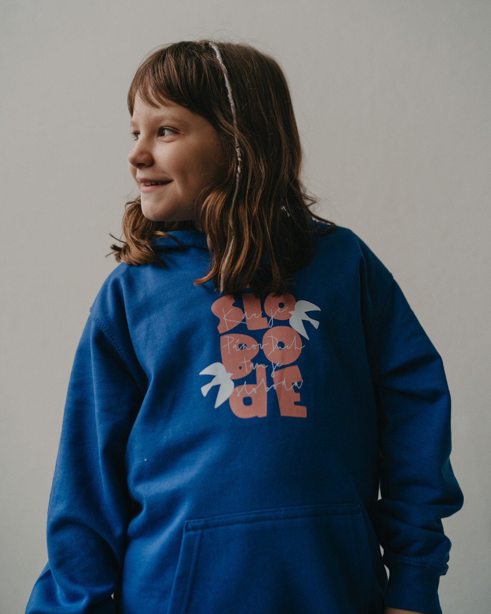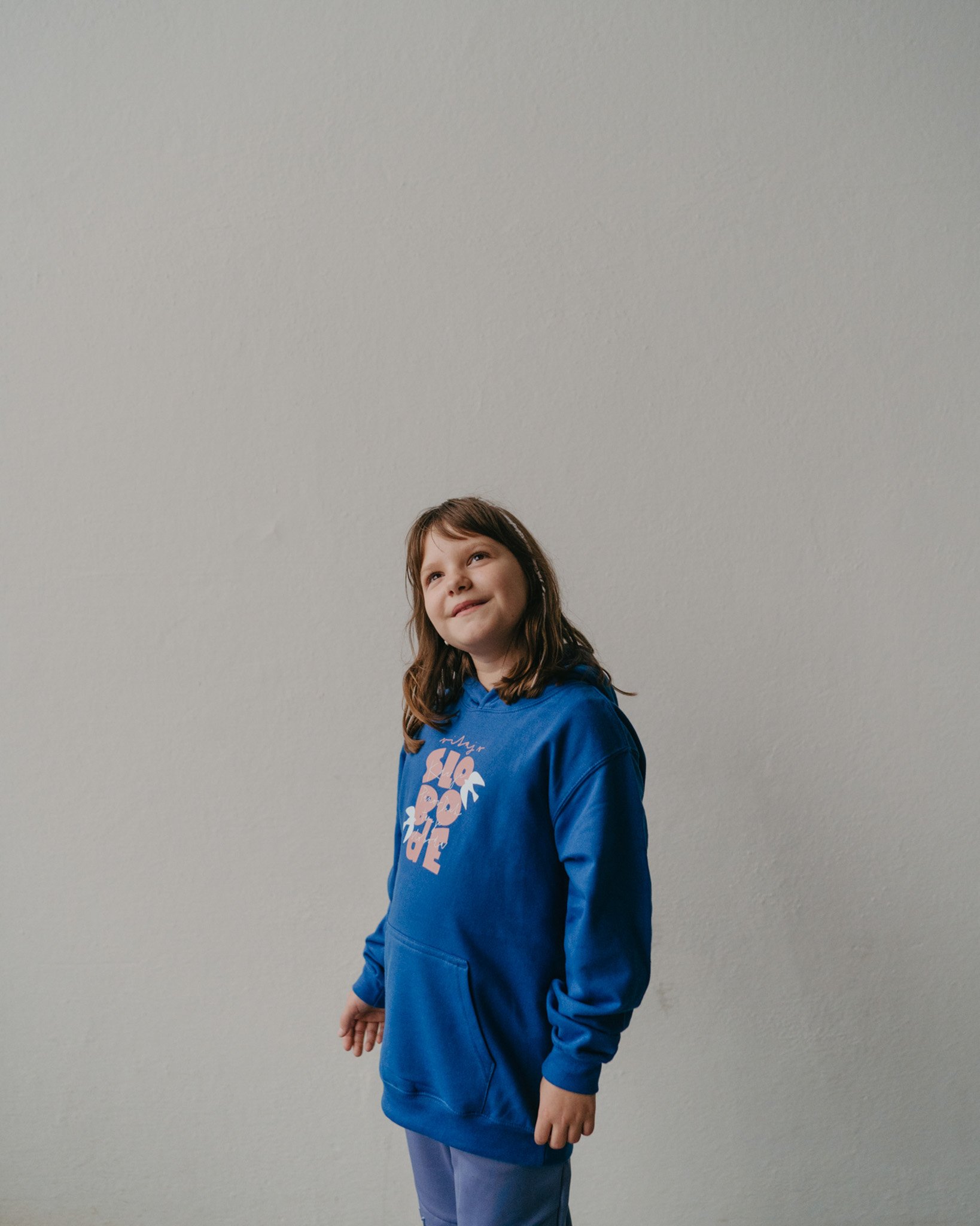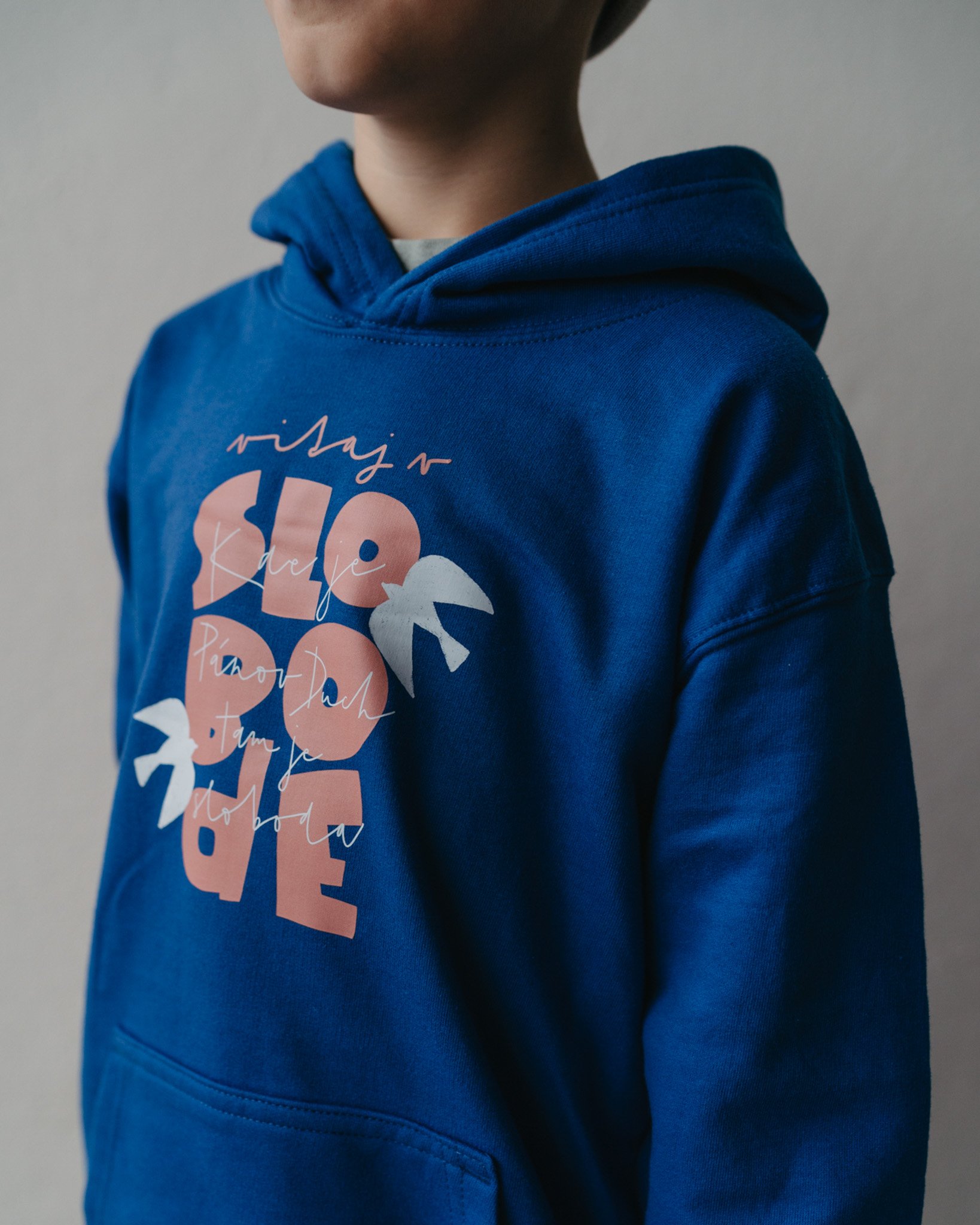 Strih: Mikina má detský rovný strih, kapucňu a klokanie vrecko.