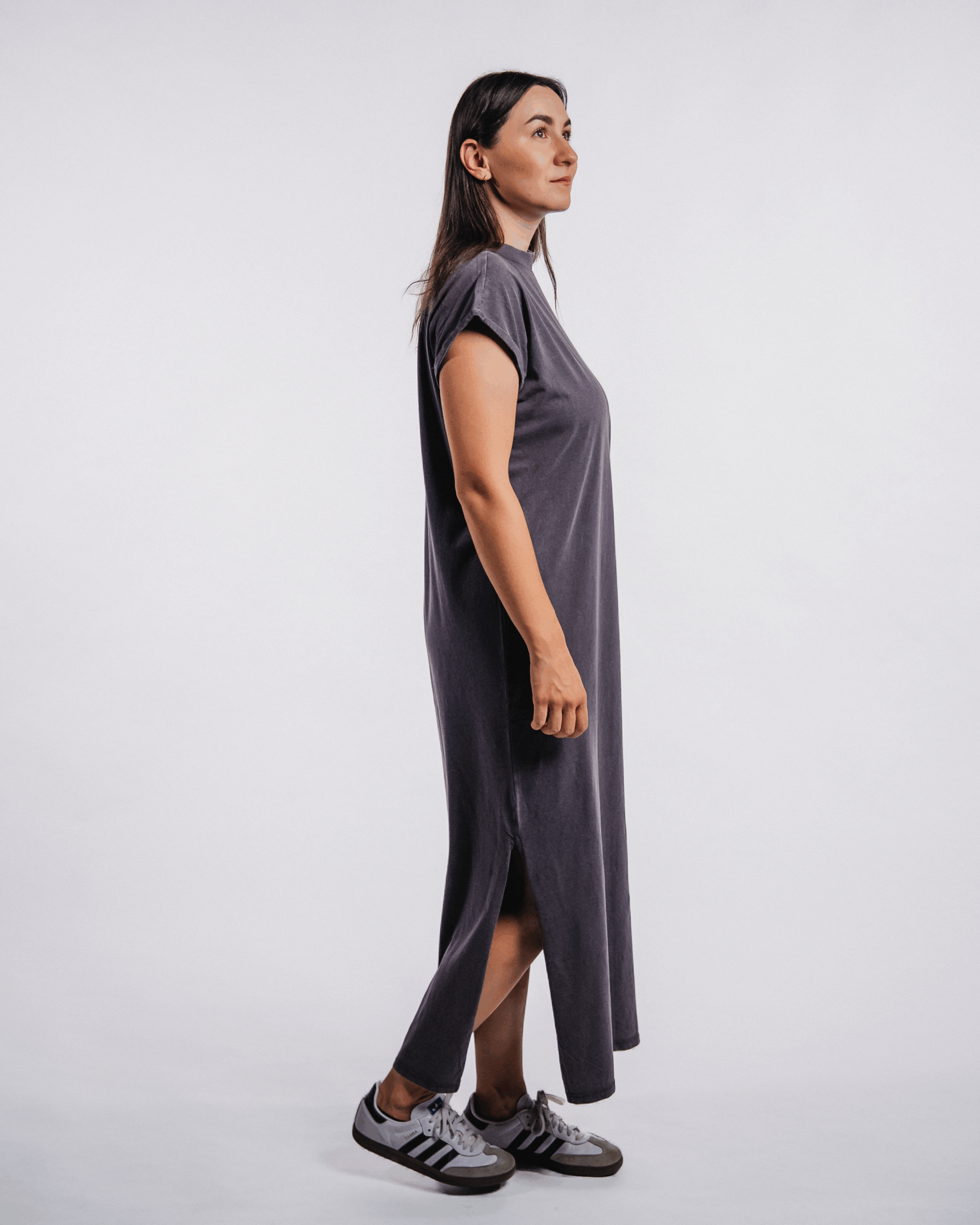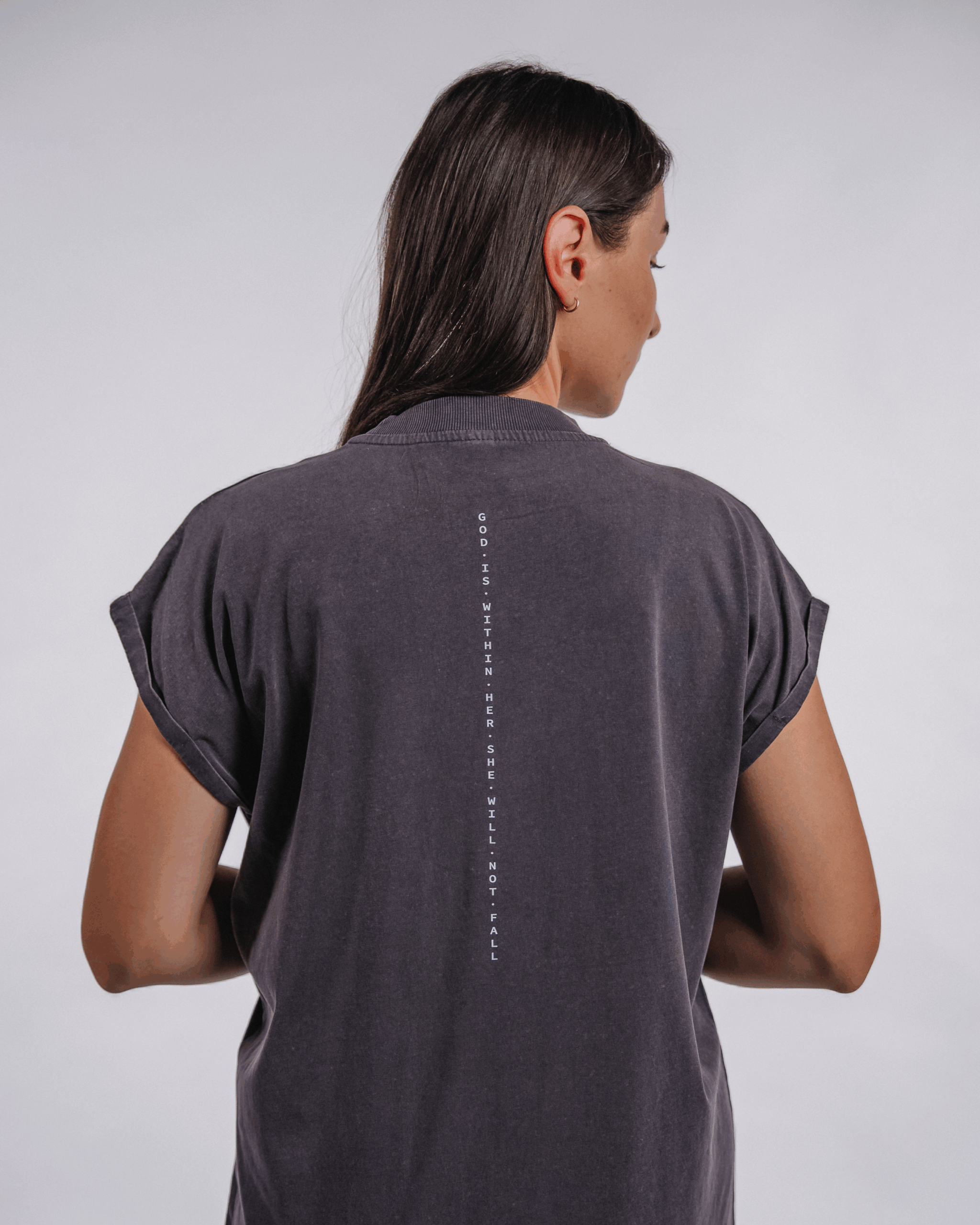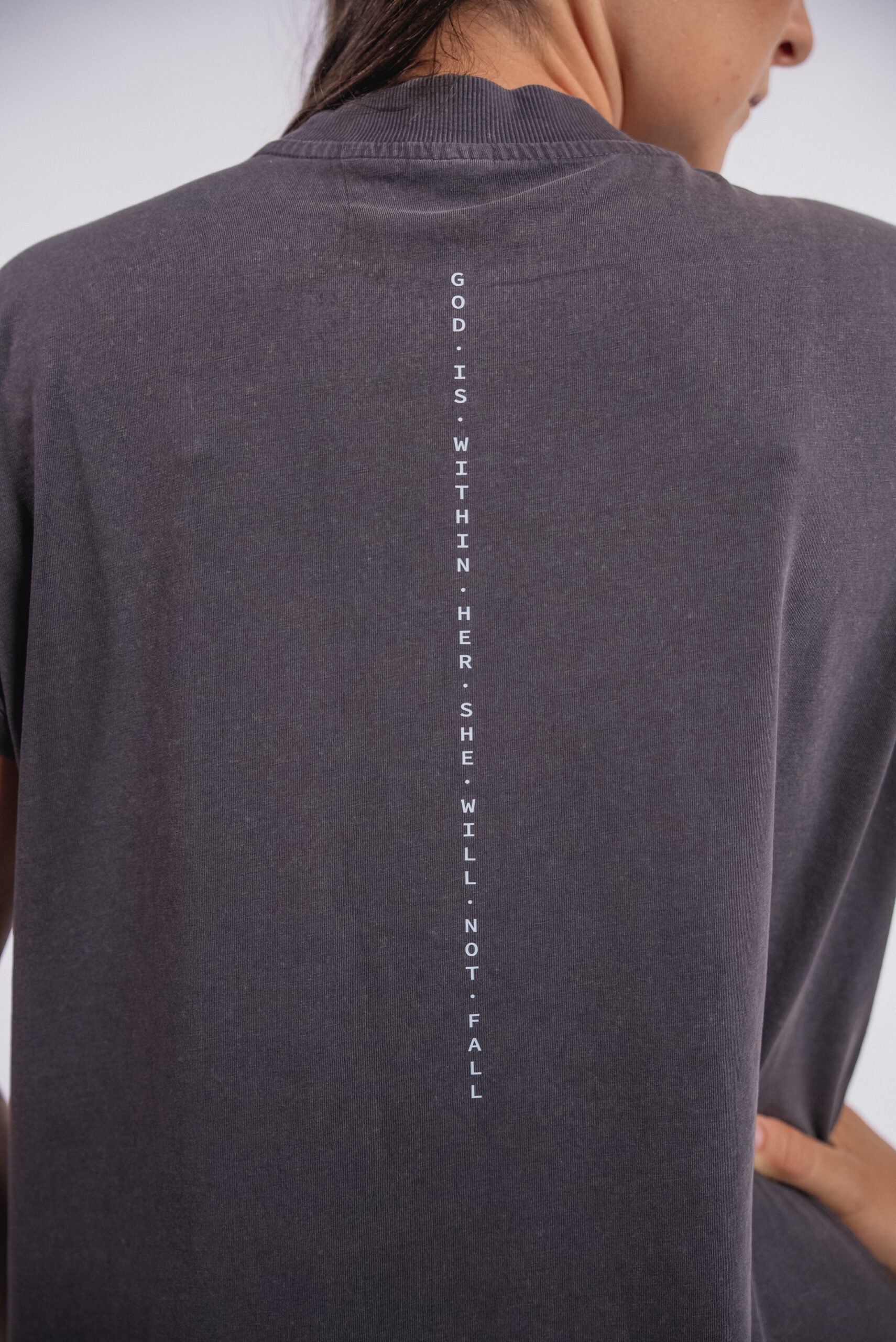 Tieto majú elegantný dlhý strih, jemný golierik a krátky rukáv a sú vyrobené z ľahkého a vzdušného materiálu, v ktorom ti bude príjemne sviežo aj napriek letným horúčavám. Šaty majú jednoduchý strih, rozparky na bokoch a minimalistický dizajn na chrbte. Nápis je parafráza urývku zo Žalmu 46 – “ God is within her she will not fall.“, ktorú môžeme preložiť aj takto: Boh je v nej, nezakolíše sa. Táto veta je obrazným spôsobom vyjadrenia dôvery v Božiu prítomnosť a ochranu. Môžeme ju aplikovať aj osobne – na ženu, ktorá dôveruje Bohu a v ktorej Duch Boží prebýva.